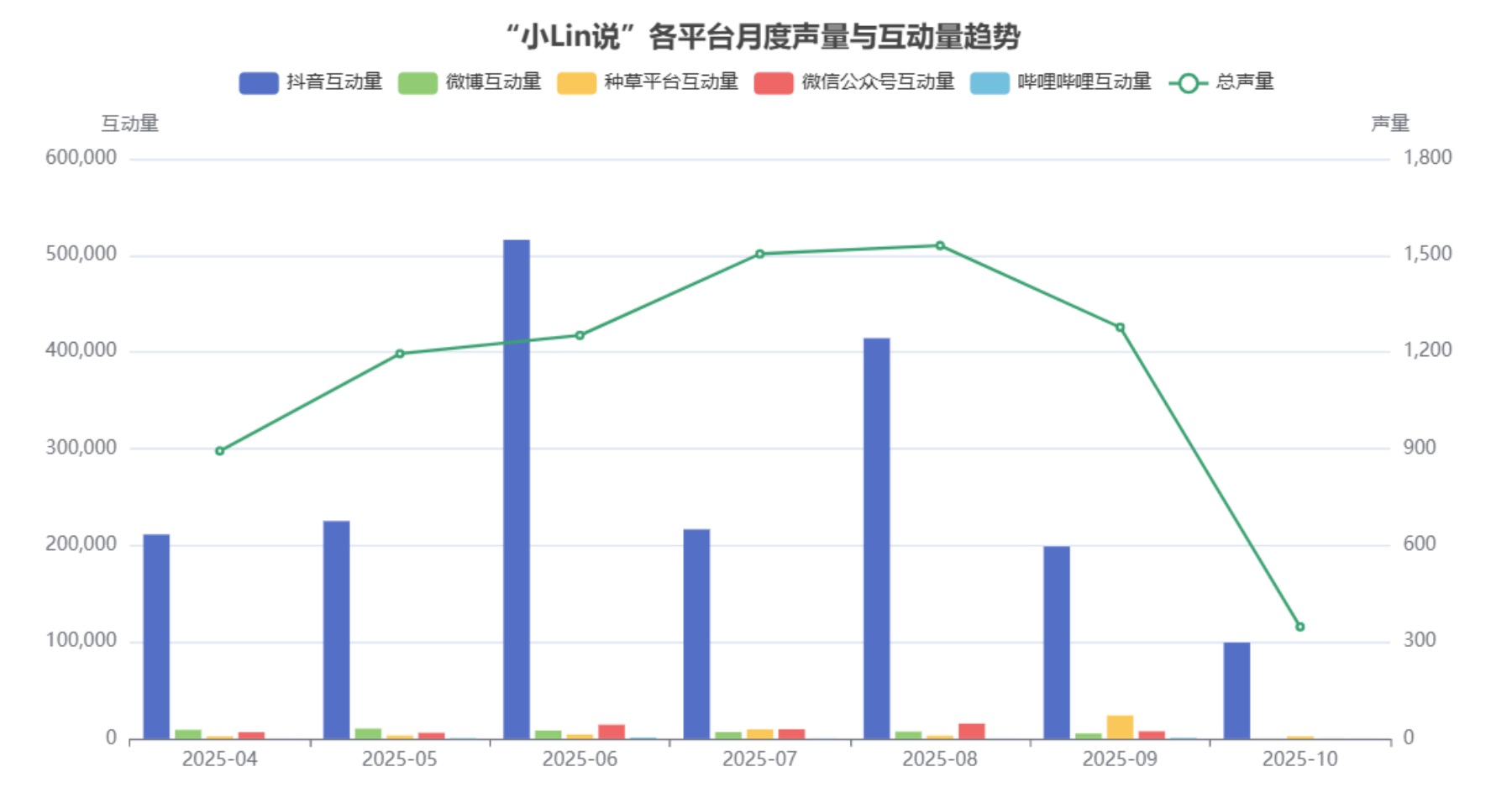 通过对近六个月各平台月度数据的追踪,可以发现“小Lin说”的内容发布与市场热点、平台活动紧密相关,并通过爆款内容在特定月份实现显著的互动增长。