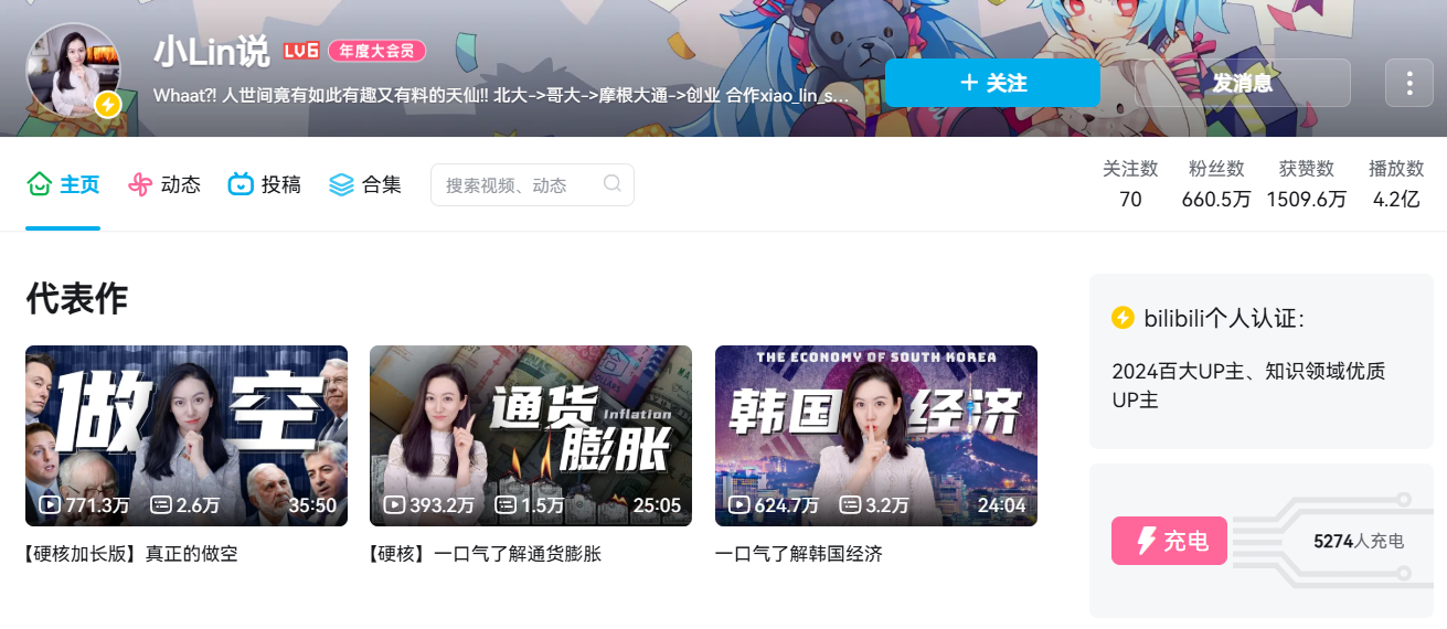 “毕业于北京大学经济学院|前华尔街摩根大通分析师|创业”是“小Lin说”的专业背景标签。其本名邹鲁秦,本科毕业于北京大学,研究生毕业于哥伦比亚大学,并曾就职于纽约摩根大通投行部,同时是求职平台Offer帮的创始人[21]。这些横跨学术、金融实战与互联网创业的经历,为其内容提供了强有力的专业支撑和独到见解[20]。