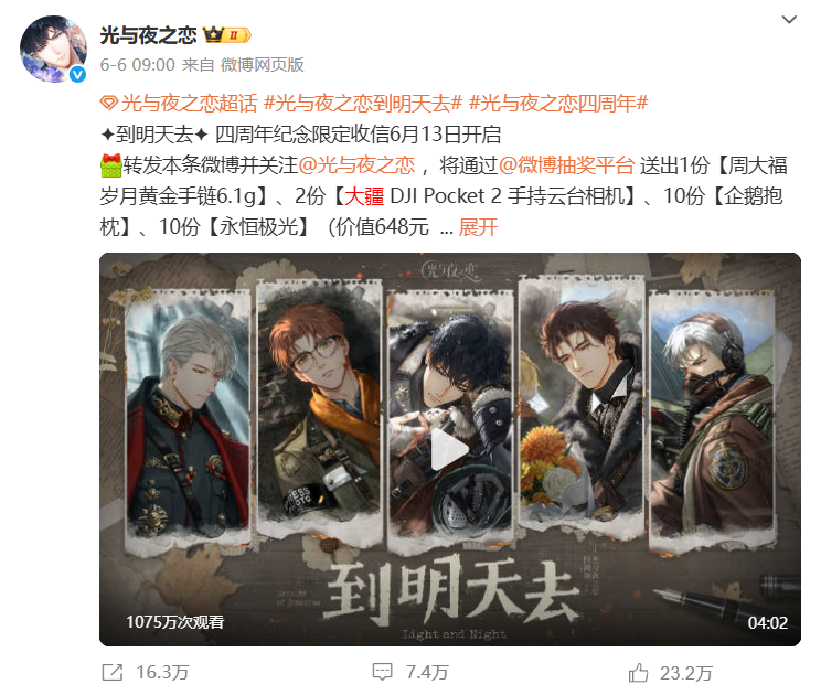大疆积极与游戏IP等进行跨界合作,以拓展年轻用户群体。例如,与手游《光与夜之恋》四周年纪念活动合作,将大疆Pocket 2作为抽奖奖品,单条微博互动量高达47万,成功触达了游戏圈层的年轻用户。