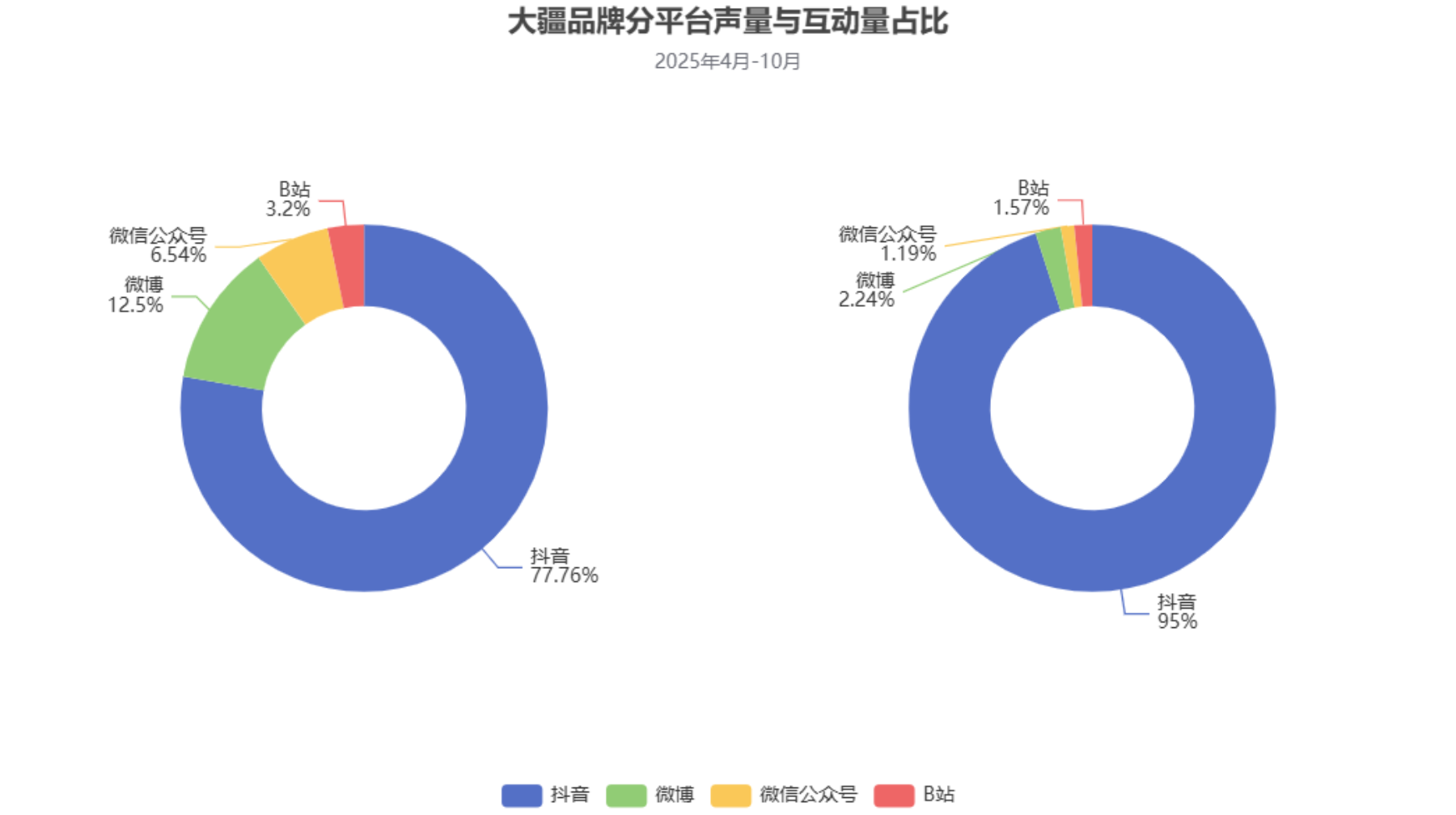 - 抖音是绝对核心: 抖音平台贡献了近78%的品牌总声量和高达95%的总互动量,是大疆品牌传播和用户参与的绝对主导平台[13]。这表明大疆在短视频内容营销和UGC生态建设方面表现出色。