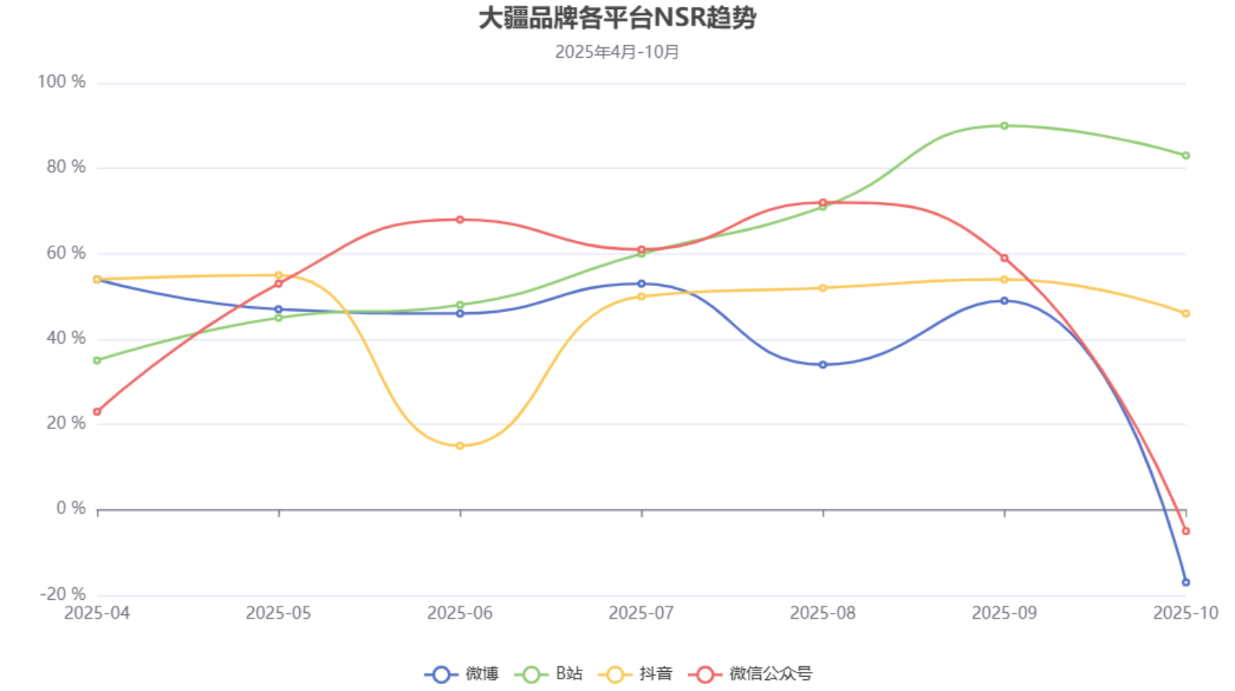 - 10月情感危机爆发: 微博和微信公众号的NSR在10月份断崖式下跌,分别降至-17%和-5%[9,11]。这明确归因于“大疆预告降价已购买消费者退货维权”事件,该事件迅速引发了强烈的负面舆情,严重损害了品牌在用户心中的信誉。