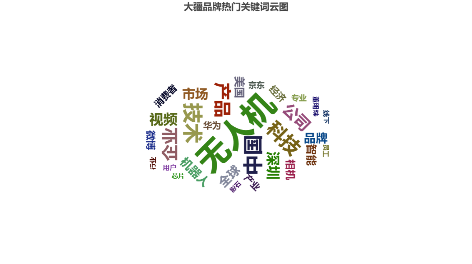 关键词云图显示,除了“大疆”、“无人机”等核心词外,“技术”、“科技”、“中国”、“消费者”、“视频”等词汇也频繁出现,反映了公众对大疆品牌在技术实力、民族品牌形象、消费者关系和产品应用领域的高度关注[53,54]。