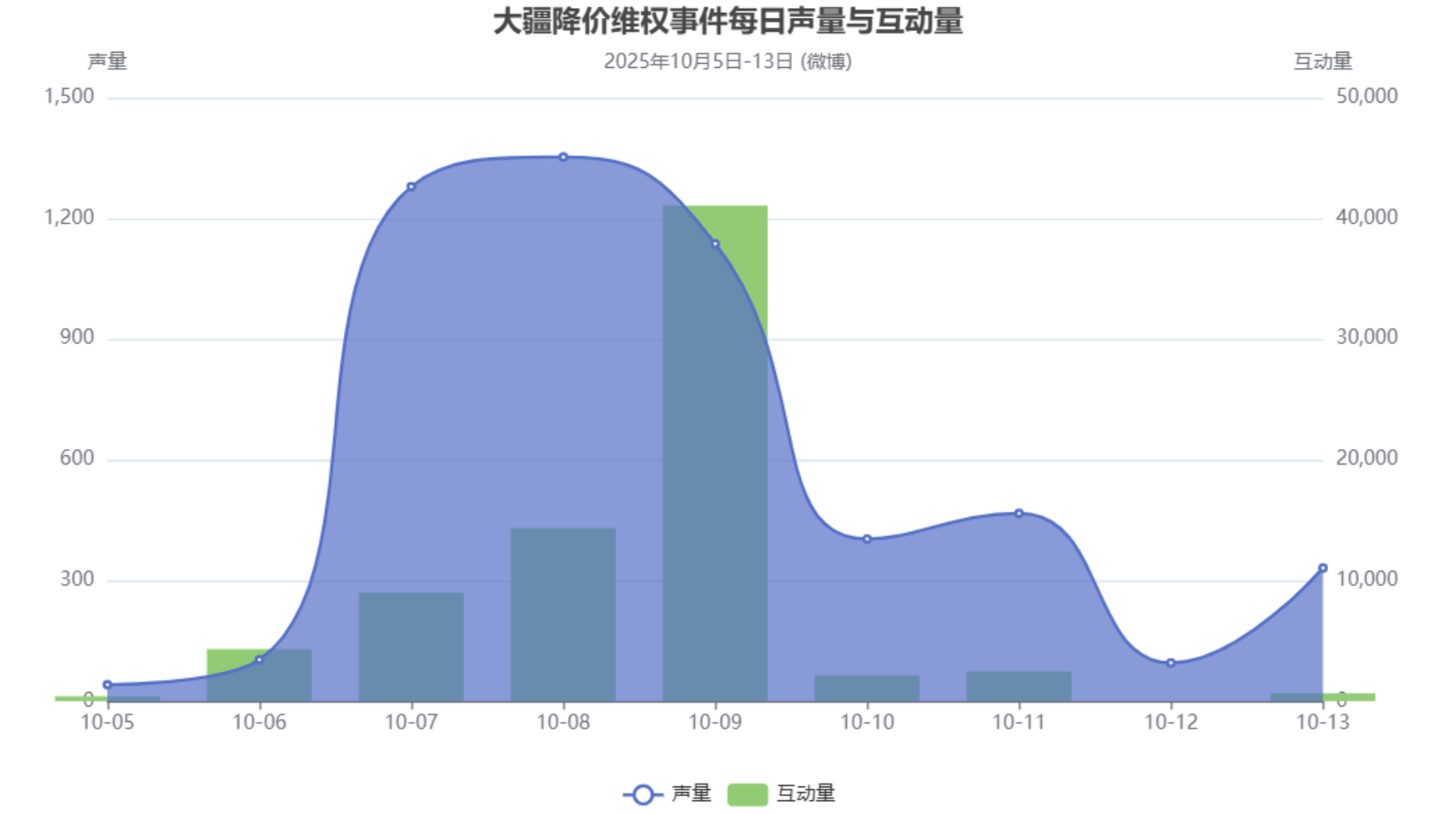 “大疆降价”相关话题的声量在10月7日开始急剧攀升,于10月8日和9日达到顶峰,微博单日声量分别达到1,353和1,137[40]。互动量则在10月9日(降价正式生效日)达到惊人的41,070[41]。声量和互动量的同步爆发,表明该事件迅速成为全网关注的焦点,消费者情绪集中爆发。