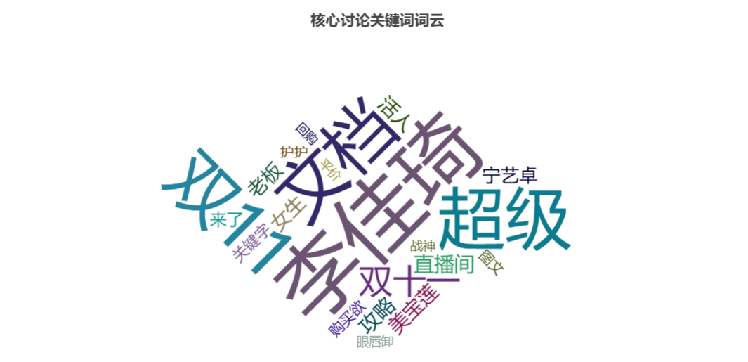 除了声量集中地与声量类型外,我们还可以对用户讨论的内容进行聚类分析,通过UGC的观点主题反映人群的精准程度。数说Social Research显示,10月以来,用户的讨论高度集中于本次营销的核心人物、活动主题和产品本身,对双十一的优惠机制与产品功效表示出极大兴趣,说明前期种草的方向精准。