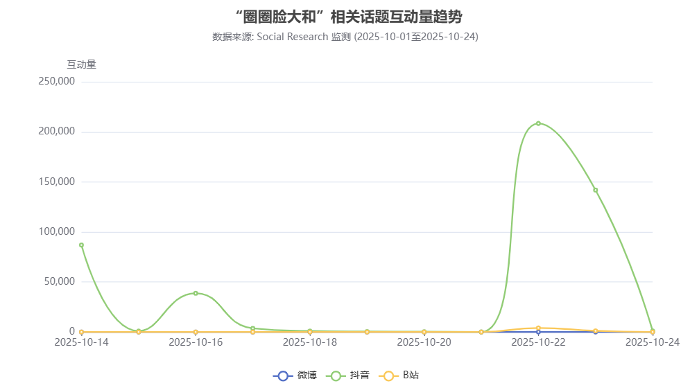 在2025年10月1日至10月24日期间,“圈圈脸大和”的社媒声量在角色技能机制爆料后呈现爆发式增长,尤其以抖音平台最为显著。声量高峰集中于10月22日至24日,这明确指向官方的技能爆料是引爆舆论的核心事件。
