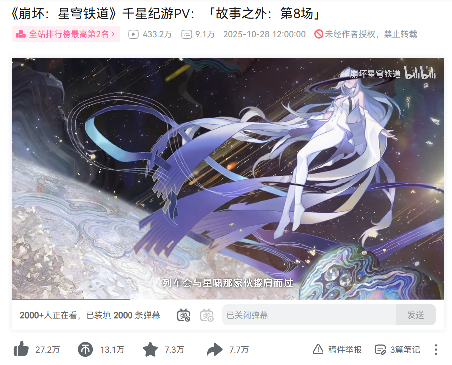 新发布的《千星纪游PV:「故事之外:第8场」》成功引爆社媒,发布当日在Bilibili平台互动量高达 68万次 ,远超其他平台,再次验证了其在角色塑造和剧情预告方面的强大号召力 [31] 。然而,PV展示的悲剧性“IF线”结局也导致了玩家社群的负面情感涌现,发布当天Bilibili的NSR骤降至-100% [33] 。这种“叫好又叫骂”的现象,根源在于PV内容本身的高度戏剧性和情感张力,是玩家对剧情与角色高度投入的表现。