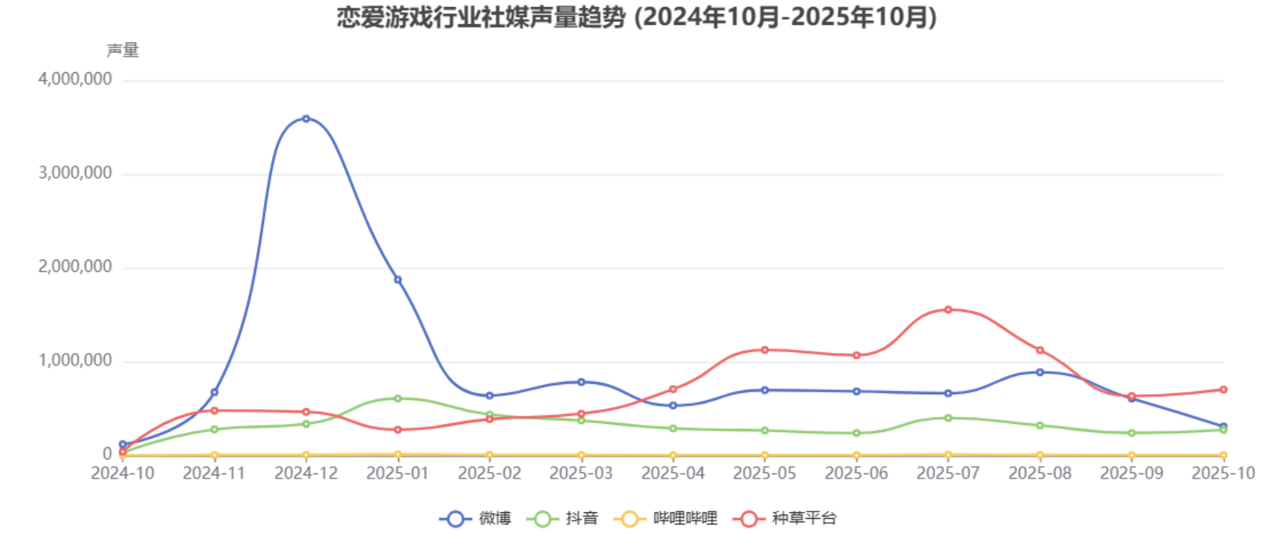 本报告旨在全面分析《恋与深空》在过去一年(2024年10月至2025年10月)于微博、抖音、B站、种草平台等主要社交媒体平台上的营销表现、用户反馈及关键事件。报告揭示,游戏凭借其独特的角色魅力、持续的版本更新以及多元化的营销策略,在整体上维持了较高的社媒热度,尤其在抖音平台,互动量显著领先且净情感度(NSR)保持稳定。