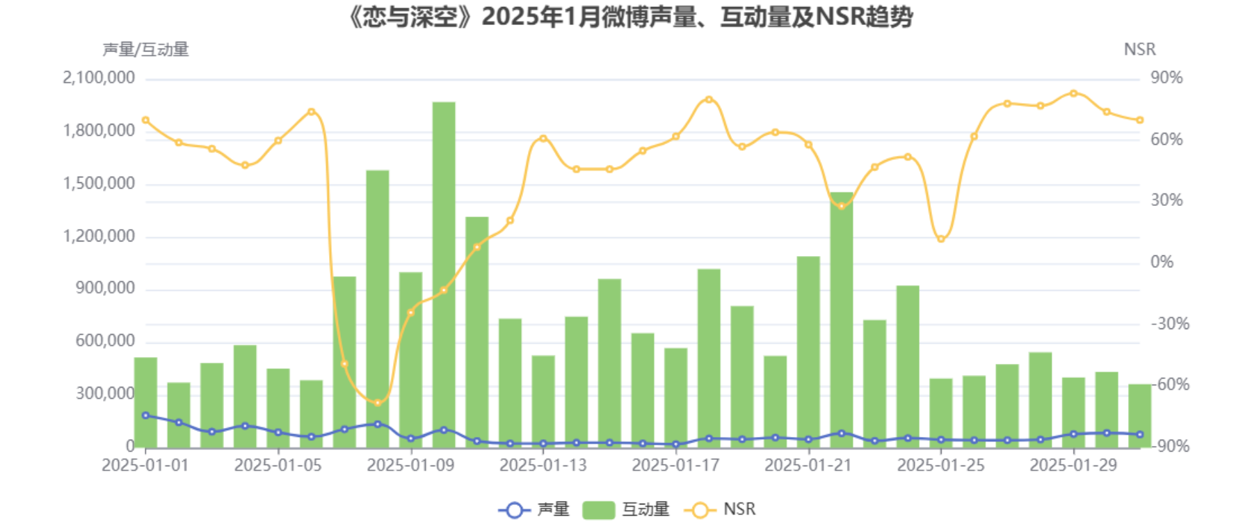 《恋与深空》的社媒热度受到游戏版本更新、新角色发布和营销活动等多种因素的影响。从整体趋势来看,游戏的社媒声量和互动量在 2024年12月和2025年1月 达到高峰,随后有所回落,但在特定时间节点(如角色生日、大型活动)仍会出现明显的增长。 [1,2]