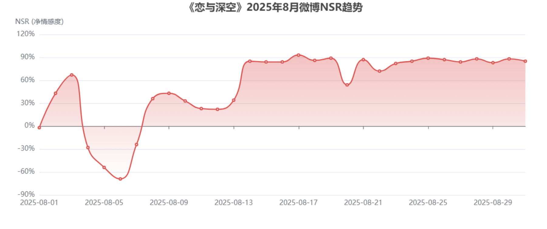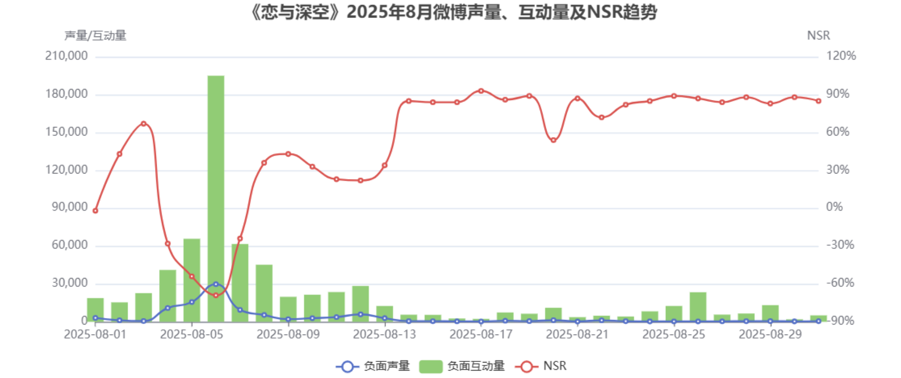 8月4日至6日,NSR连续大幅下降,并在6日达到-69%的最低点。 [26] 同期,负面声量和互动量呈爆炸式增长,在6日达到峰值(声量29850,互动量195004),形成了显著的共振现象,明确指出该时段发生了严重的负面事件。 [27,28]