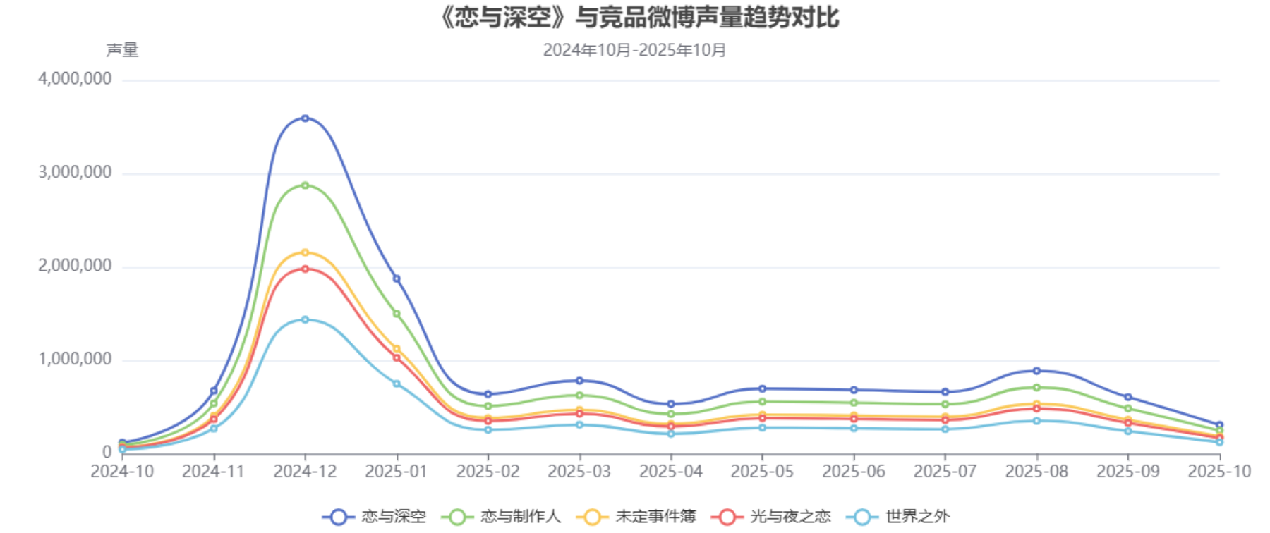 《恋与深空》凭借其3D技术优势和创新的恋爱互动模式,在女性向游戏市场中占据领先地位。 [32] 与《恋与制作人》、《未定事件簿》等传统2D恋爱游戏相比,《恋与深空》在视觉呈现和沉浸式体验上更具优势。从下图可以看出,在声量上,《恋与深空》在2024年12月和2025年1月远超其他竞品,展现了强大的市场爆发力。