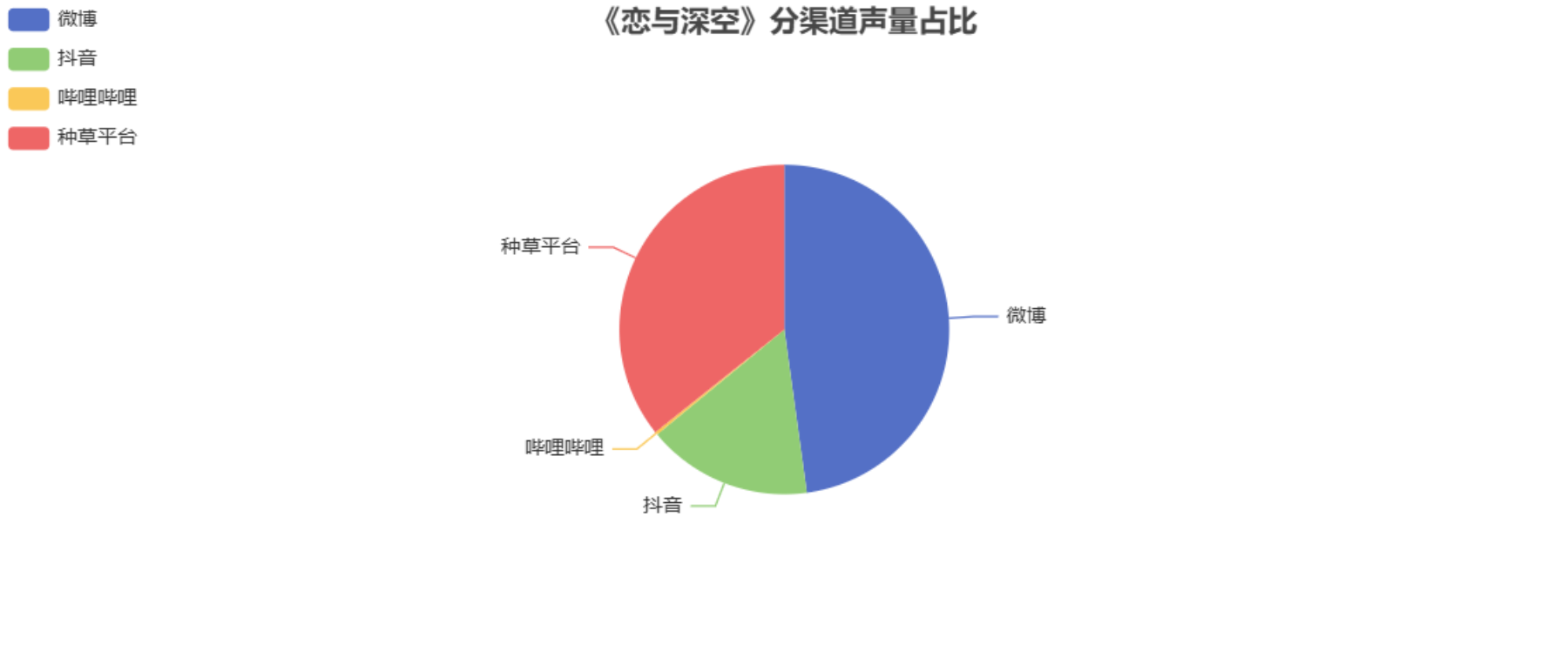 《恋与深空》在不同社交媒体平台上的声量和互动量分布呈现出显著差异,反映了各渠道的独特属性和用户特征。总体来看, 微博 和 种草平台 是《恋与深空》的主要声量来源,分别占比 47.82% 和 35.71% 。 [6] 这表明这两个平台的用户更倾向于讨论和分享与游戏相关的内容。然而,在互动量方面, 抖音 以 71.92% 的绝对优势遥遥领先,成为用户参与度最高的平台。 [6]