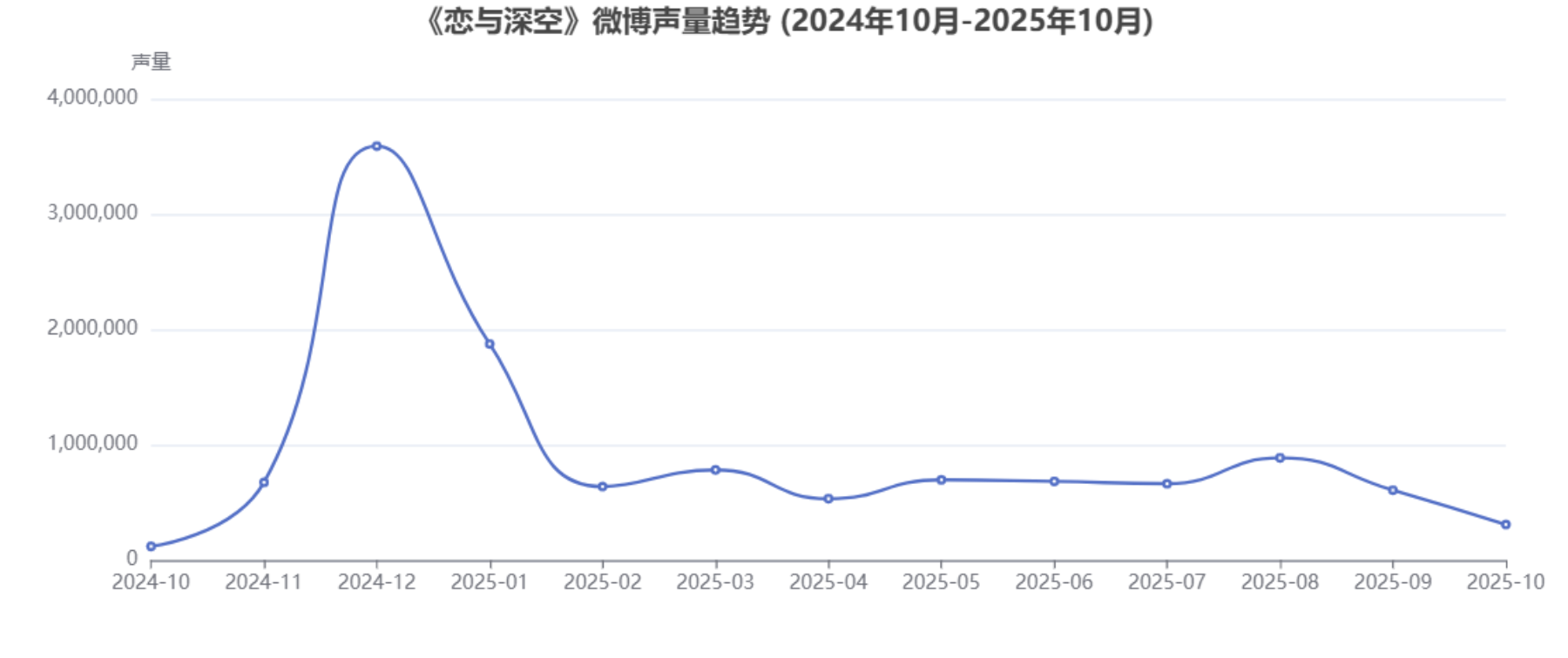 - 声量高峰: 2024年12月,声量达到峰值,主要得益于“微博之夜”评选活动和圣诞节相关的角色互动内容。 2025年1月,3.0年度版本“万象遇你”及新男主“夏以昼”上线,声量依然维持在高位。