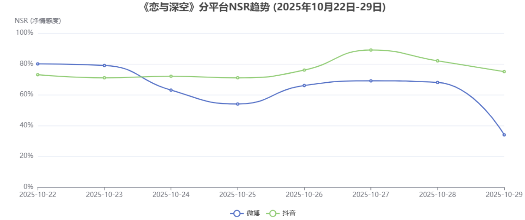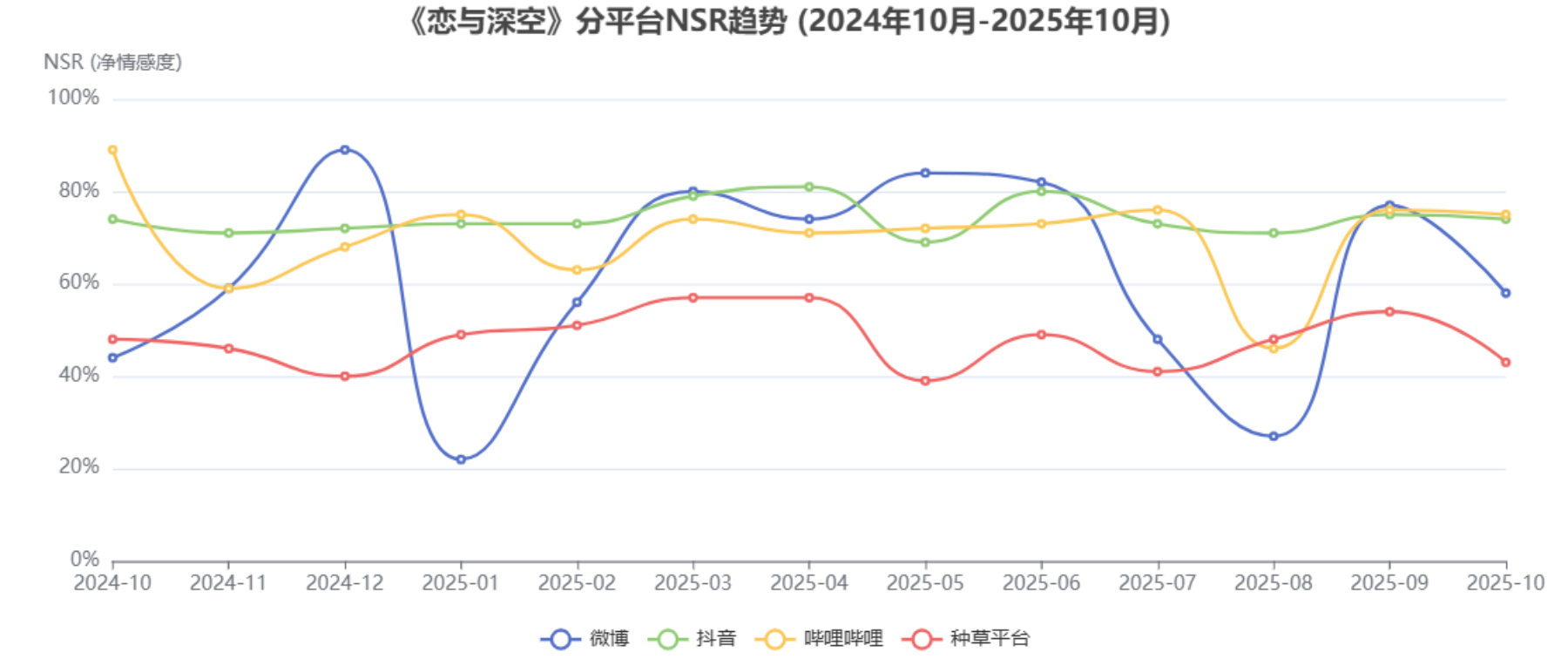 《恋与深空》在不同社媒平台上的情感趋势呈现出差异化特征。整体而言, 中性情感 占据主导地位,表明多数用户对游戏的讨论较为客观,可能集中在游戏攻略、日常体验等方面。 [6] 然而,正面与负面情感的占比及变化趋势,则揭示了游戏在不同平台上的口碑差异以及潜在的危机。抖音平台以积极、娱乐性的UGC内容为主,NSR相对稳定且偏高。 相反,微博和种草平台则聚集了更多对游戏机制、剧情设定、运营策略等方面进行深入讨论和批评的用户,NSR波动或偏低。