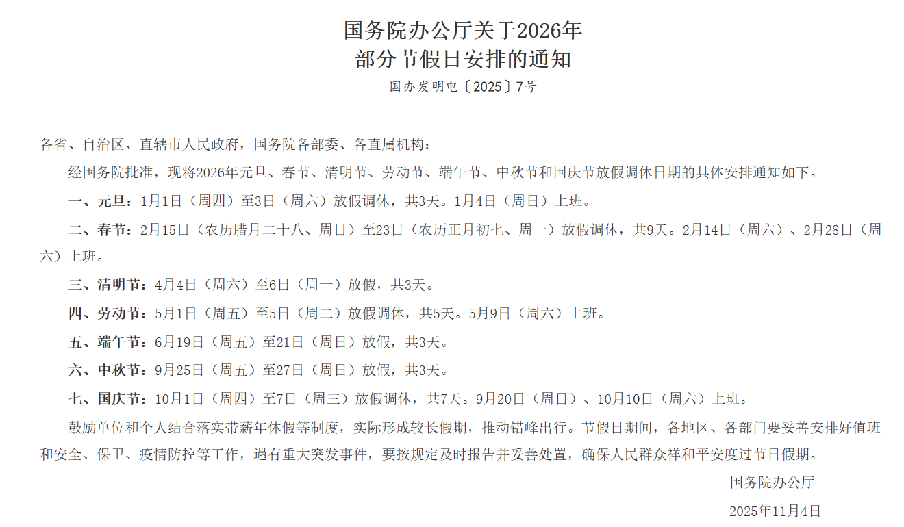 2026 年内地法定节假日安排已正式公布,涵盖元旦、春节、清明节等七大节日,部分假期通过合理请假可拼接成长假,无论是计划出行还是安排休息,提前了解相关信息能更高效规划时间。以下为详细的节假日安排及实用拼假策略。
