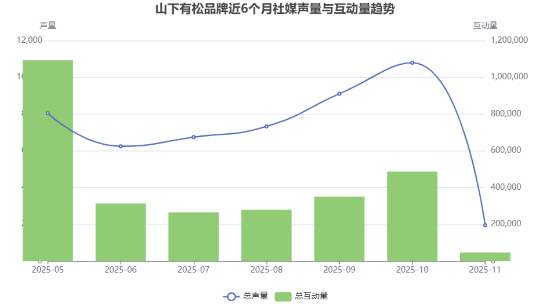 在2025年5月10日至2025年11月10日的监测周期内,“山下有松”品牌通过一系列精准的营销活动,在各大社交媒体平台获得了显著的声量与互动。整体趋势呈现波动上升,并在特定月份因关键营销事件驱动而形成高峰。