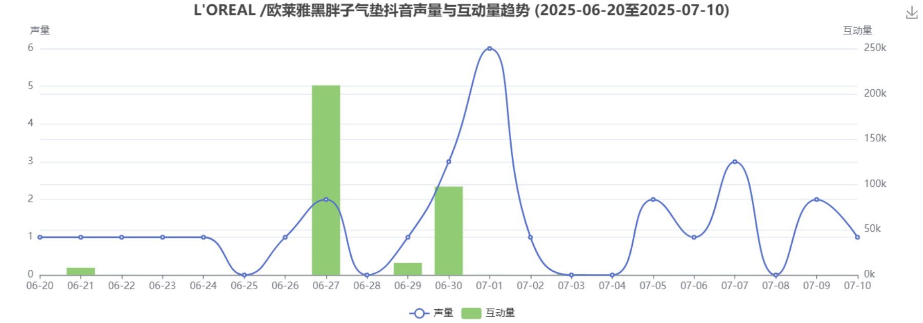 在2025年6月20日至7月10日期间,“欧莱雅黑胖子气垫”的抖音营销活动在互动量上表现突出,尤其在6月下旬形成了多个互动高峰。
