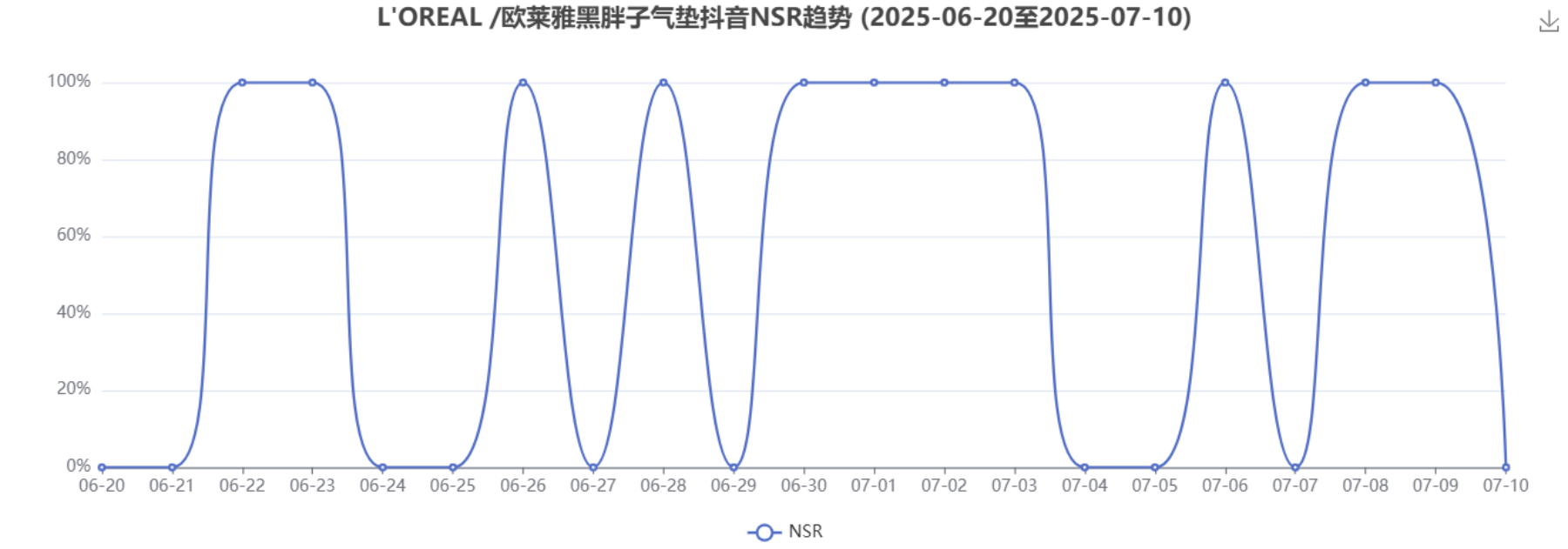 本次“欧莱雅黑胖子气垫”抖音营销活动期间,消费者的整体反馈积极正面。NSR(净情感值)在0%和100%之间波动,平均值为55%,且未检测到任何负面情感,表明营销活动成功营造了正向的舆论氛围。 [50,49]