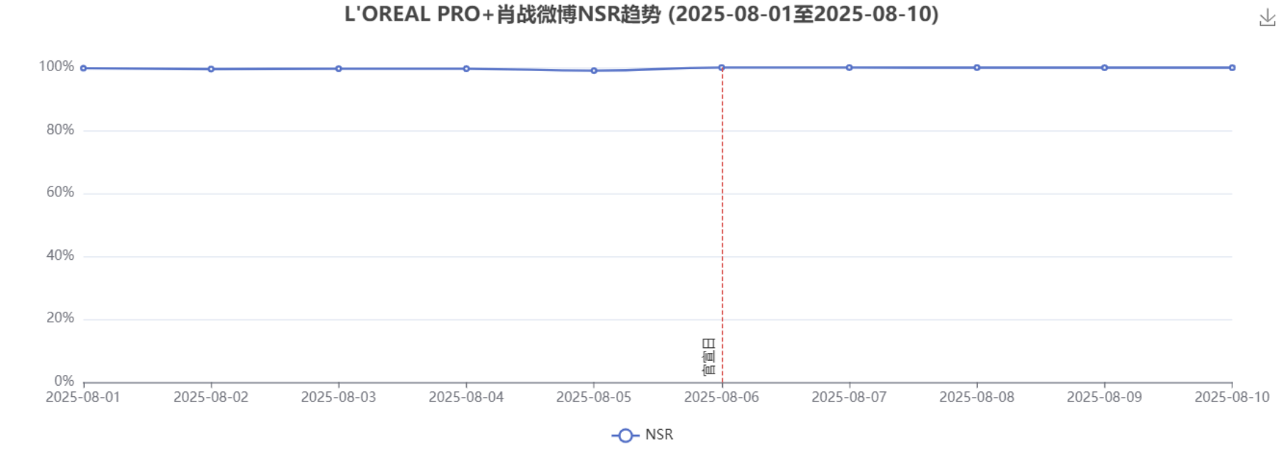 在肖战代言事件中,消费者反馈呈现压倒性的正面态势。整个活动期间,微博平台的NSR(净情感值)始终维持在99%以上的极高水平,几乎无负面情绪。