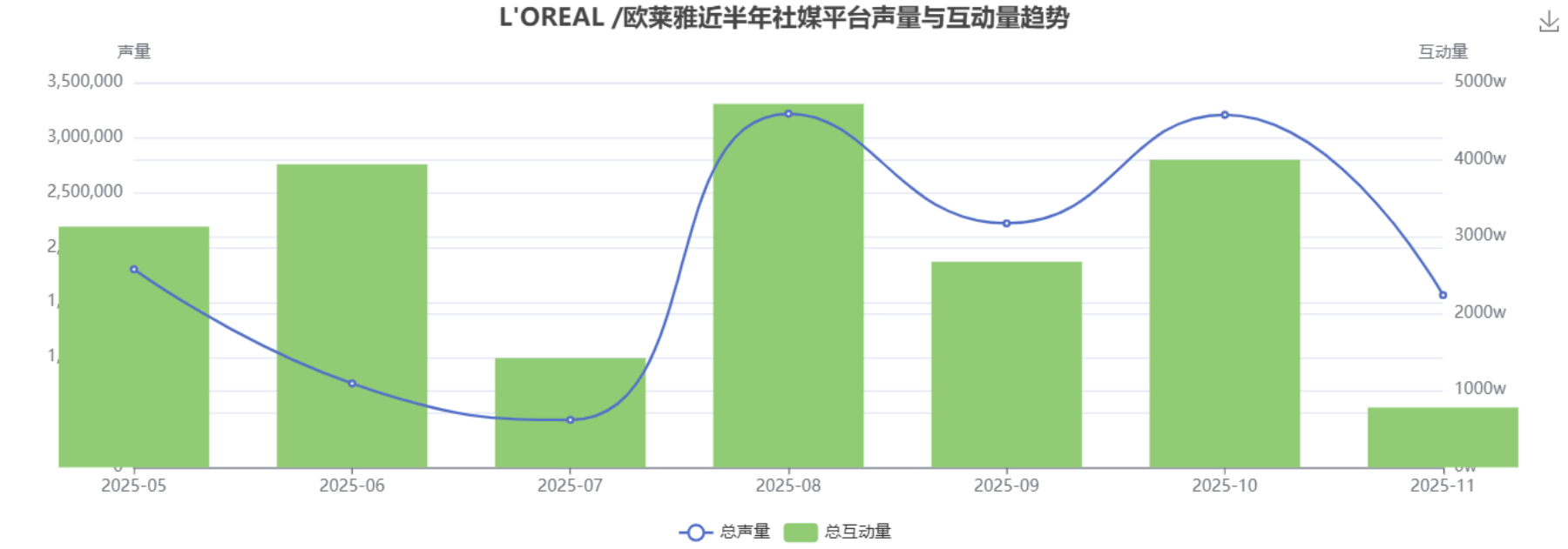 在2025年5月至11月期间,L'OREAL /欧莱雅在各大社交媒体平台上的声量与互动量呈现出显著的波动趋势,反映了其营销活动与市场推广的节奏。整体而言, 8月和10月是两个重要的营销高峰期 ,而7月则相对平淡。