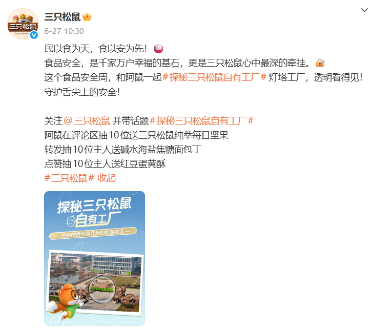 - 微博平台 :以PGC(专业生产内容)为主,涵盖品牌建设与公关、产品推广与新品发布、企业文化讨论以及负面事件关联等。 内容形式以图文和官方视频为主,侧重品牌公关和新品发布。例如,#探秘三只松鼠自有工厂#活动以视频配合图文的形式,强调产品品质和食品安全。在企业文化讨论方面,2025年11月25日,“极目新闻”发布“#员工入职三只松鼠咋就成了鼠辈#”的PGC内容,引发了关于三只松鼠“花名文化”的讨论。
