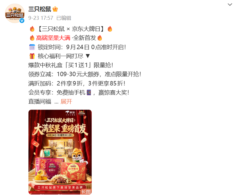 - 中秋节前夕的强力促销活动(核心驱动因素) :临近中秋,三只松鼠通过多个带货博主(如优品小蜜、居家好男人、持家老铁、种草小海龟等)在微博上集中推广月饼礼盒(如“山河揽月”、“盈盈皎月礼”)和坚果礼盒。 这些促销活动以“99元4盒月饼”、“29.4-33.5元坚果礼盒”等超低价和“大分量”、“低糖”、“送礼佳品”等卖点,极大地刺激了消费者的购买欲望和分享热情。 虽然单个帖子的互动量可能不高,但大量相似内容的集中发布和转发,形成了显著的声量和互动累积。 例如,用户“种草小海龟”在2025年9月19日10点发布的帖子,就提到了【32.9💥】三只松鼠坚果礼盒1256g,并强调“中秋送礼怎么能少的了三只松鼠呢!?”。 [50]
