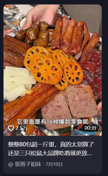 - 产品卖点与品牌调性 :三只松鼠通过强调产品的“好吃”、“划算”、“营养”等卖点,与年轻化、趣味性的品牌调性相契合。抖音上大量用户分享三只松鼠零食在追剧、日常休闲场景中的应用,以及“情侣搞笑日常”等内容,都体现了品牌融入消费者日常生活的趣味性。 通过“探秘自有工厂”系列内容和“高端坚果大满”标准发布,品牌直接体现了对“品质”和“食品安全”的重视,与“健康”调性相符。