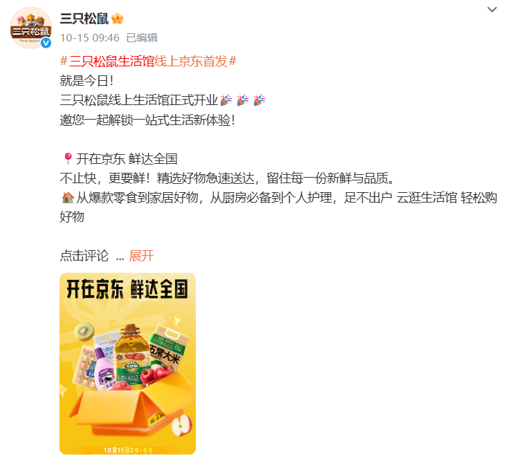 “三只松鼠生活馆”线上首发Campaign于2025年10月中旬展开,其 核心目标 在于拓展三只松鼠的产品品类,从传统的休闲零食向短保鲜食、米面粮油、母婴宠物、生活日化等高频刚需品类延伸,旨在打造一个能够满足家庭一站式购物需求的综合性平台。