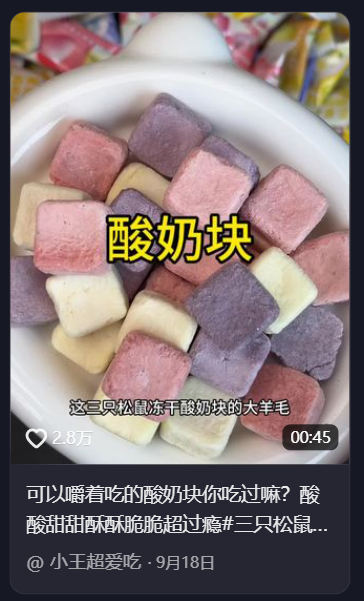 [21] 可以嚼着吃的酸奶块你吃过嘛?酸酸甜甜酥酥脆脆超过瘾#三只松鼠#酸奶块#冻干酸奶块#酸酸甜甜#零食推荐.... https://www.douyin.com/video/7551330629779967290