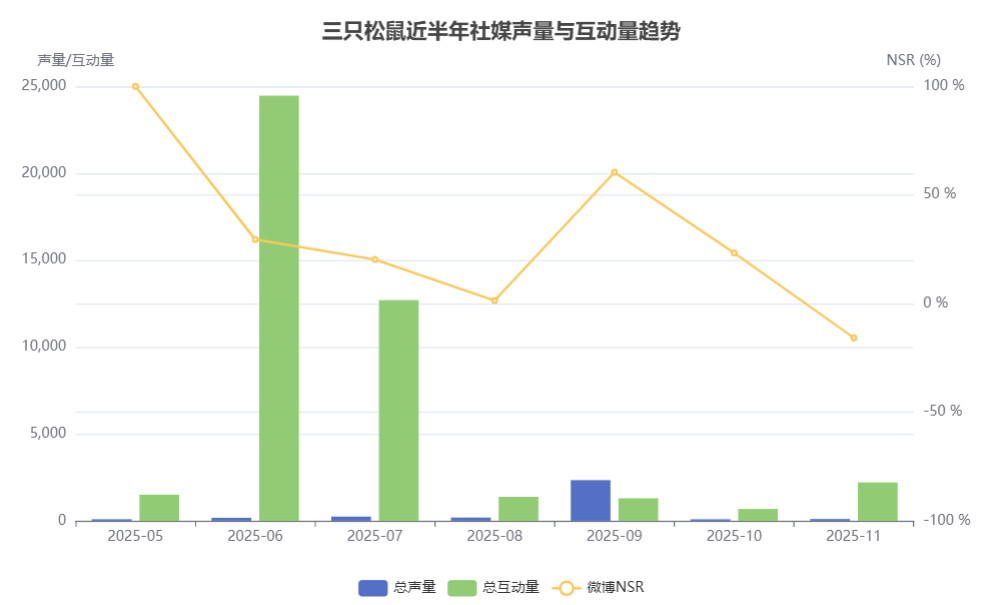 根据2025年5月28日至11月28日期间的数据显示,三只松鼠在微博、抖音和种草平台上的社媒表现各有特点。总体来看,三只松鼠在各平台的声量和互动量并非均匀分布,而是呈现出明显的波峰波谷,与特定的营销活动节点紧密相关。