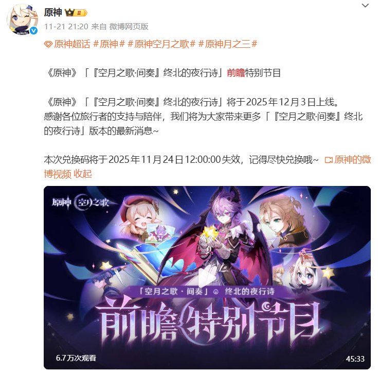 3、前瞻沟通:《原神》与《明日方舟》均十分重视与玩家的直接沟通,前者会在每个新版本上线前开展官方前瞻直播,向玩家介绍新版本的内容和活动,并通过发放兑换码等方式进行预热营销;后者则通过“制作组通讯”等形式,提前预告游戏未来的发展方向和活动计划,如提前预告了跨年系列活动。