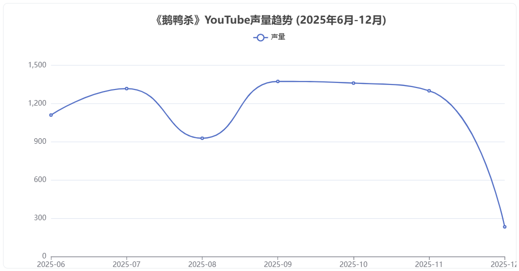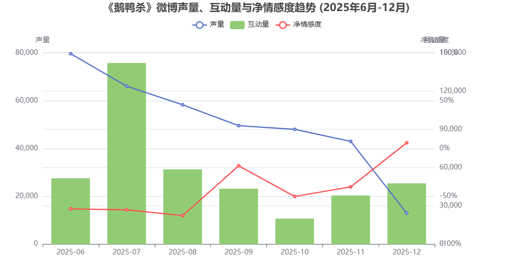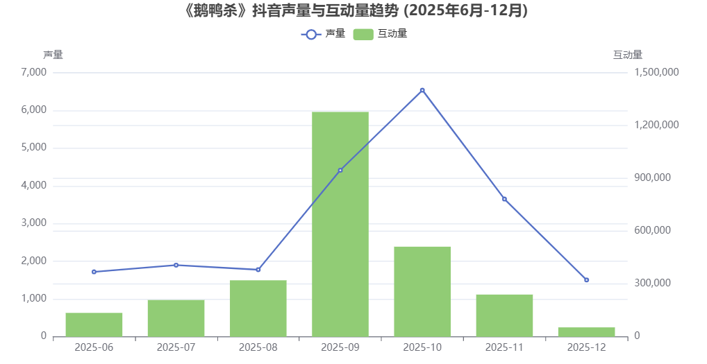 2025年6月至12月期间,《鹅鸭杀》在抖音平台的声量和互动量呈现出显著的波动趋势。整体来看,6月至8月期间,声量和互动量相对平稳,但进入9月后,两项指标均出现了显著的增长,并在10月达到峰值。具体而言: