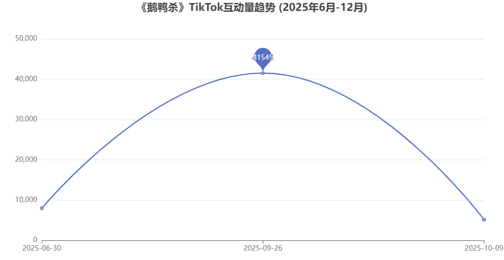 - 声量与互动量趋势分析: 从2025年6月至12月的数据来看,《Goose Goose Duck》在TikTok上的声量和互动量呈现出明显的波动趋势。互动量在 2025年9月26日 达到峰值,高达 41,545 [17] 。这一峰值与`delta_forcenews`发布的《Goose Goose Duck》x《DeltaForce》联动皮肤内容直接相关 [16] ,表明跨界联动是提升互动量的有效手段。整体来看,该时间段内《Goose Goose Duck》在TikTok上的声量为222 [18] 。