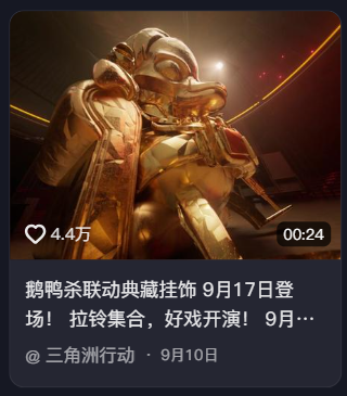 9月和10月声量及互动量的大幅增长,与《鹅鸭杀》采取的一系列营销活动密切相关。尤其值得关注的是,《鹅鸭杀》与《三角洲行动》的联动活动,成功将《鹅鸭杀》IP引入《三角洲行动》玩家群体,显著提升了其在抖音平台的曝光和讨论度。例如,用户“小贝打游戏(三角洲行动)”在9月26日发布的帖子,详细介绍了《三角洲行动》“奇怪的蛋活动”中获取《鹅鸭杀》联动枪皮的攻略,获得了近2万的互动量 [61] 。