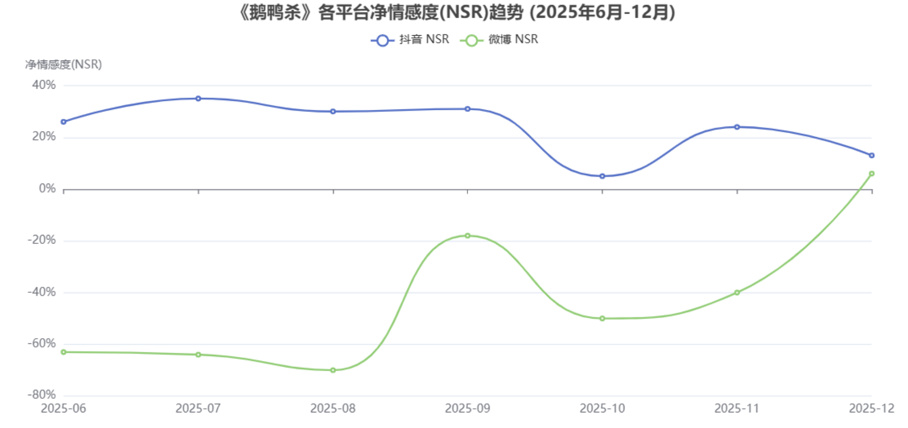 综合来看,《鹅鸭杀》在抖音和微博两大平台上的净情感度(NSR)变化趋势,反映了其营销活动和运营策略对用户口碑的复杂影响。