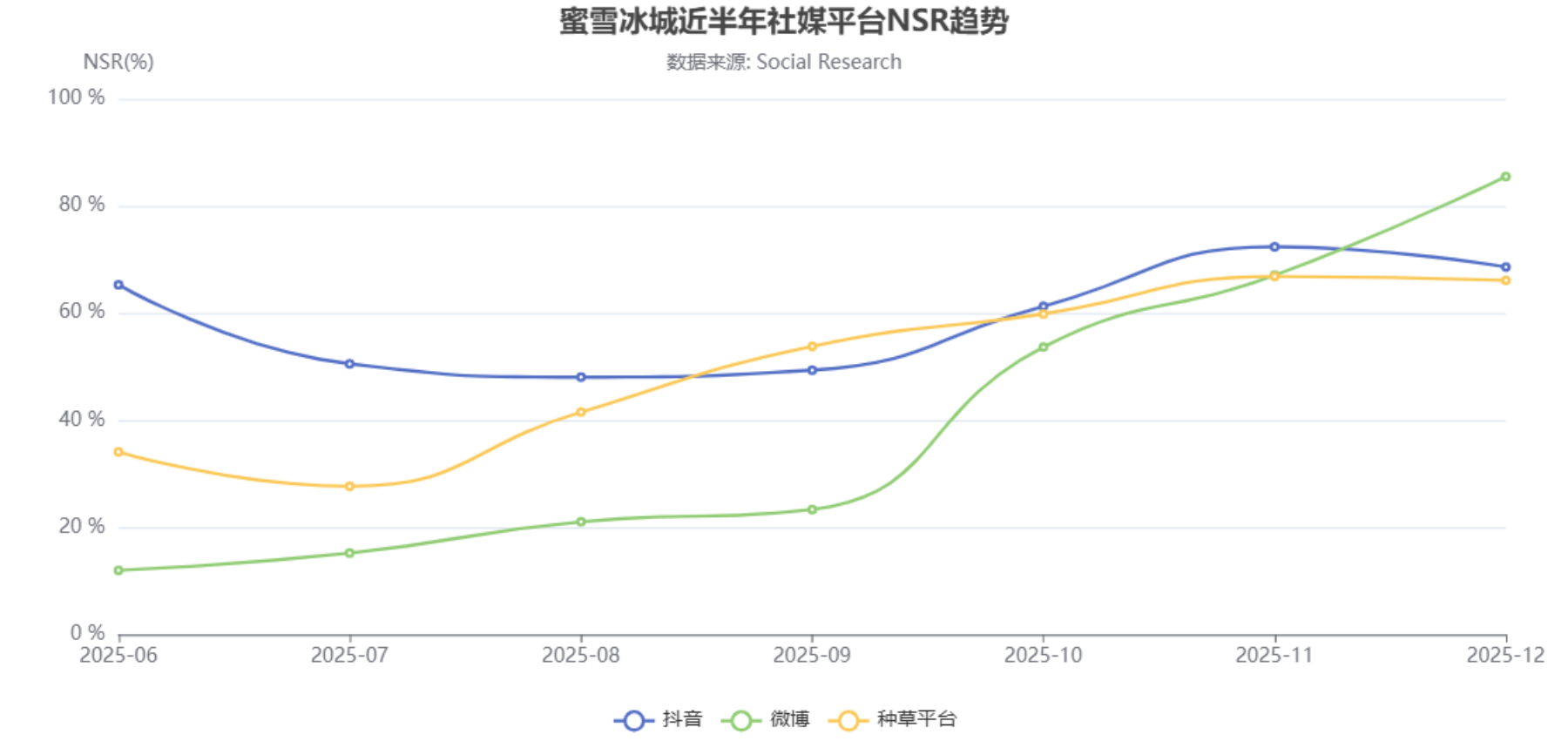 - 社媒营销动作及声量表现 :量化分析蜜雪冰城在抖音、微博、种草平台等平台的声量、互动量和NSR趋势,评估其营销活动效果。
