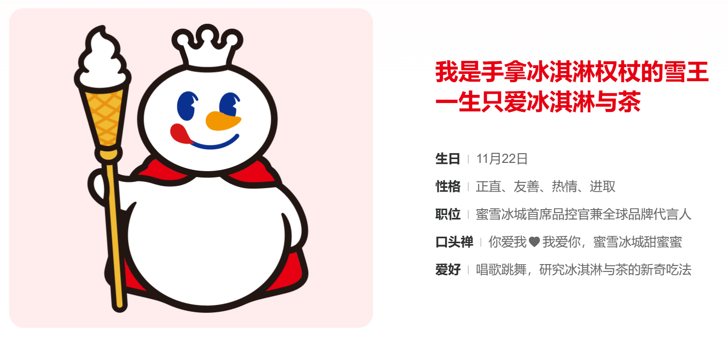 - 人格化塑造 :雪王不仅有自己的生日、性格和爱好,还拥有“首席品控官兼品牌终身代言人”的官方职位 [24,27] 。通过在B站、微博等平台发布雪王日常趣事视频,以及在线下门店进行主题活动,蜜雪冰城为消费者营造了一个沉浸式的体验环境 [27] 。