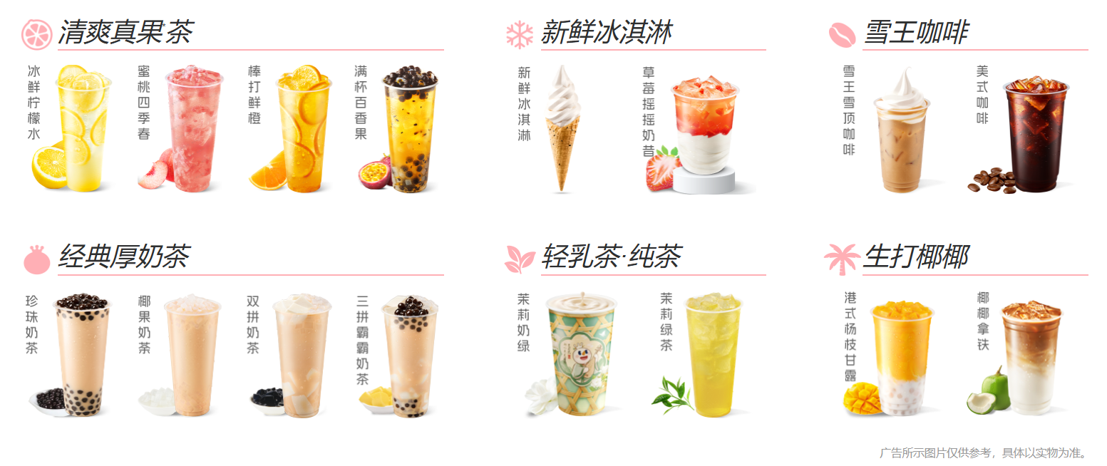 蜜雪冰城以其高性价比的核心产品而闻名。其中,冰鲜柠檬水和冰淇淋是其两大“拳头产品”。核心产品的价格通常在人民币2元至8元之间 [49] 。冰淇淋系列以3元左右的亲民价格,贡献了店铺销售额的50% [28] 。而4元一杯的冰鲜柠檬水作为核心饮品,在夏季的销售额可占饮品总销售额的60% [28] 。这些明星产品不仅价格亲民,而且口味经典,深受消费者喜爱。