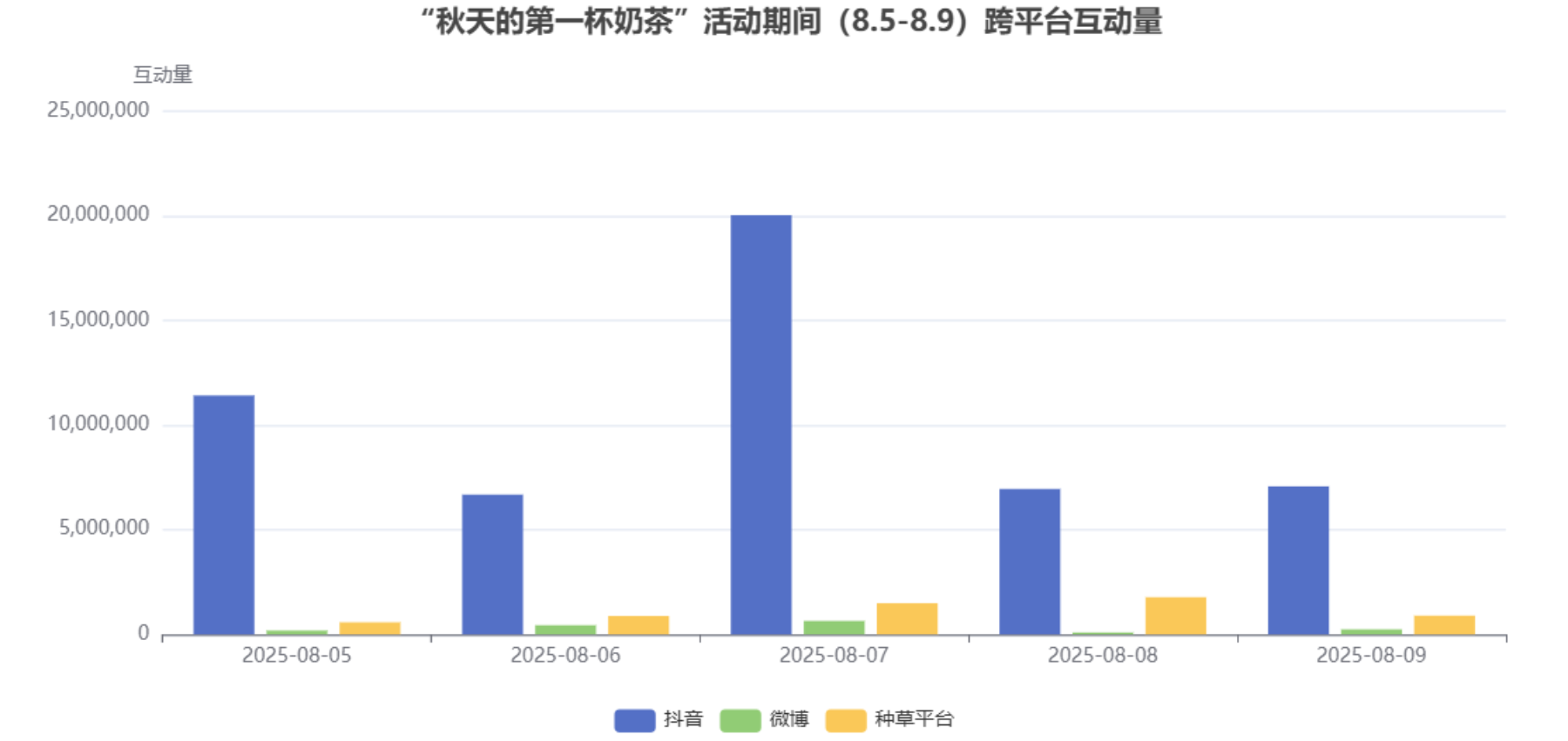 - 种草平台:口碑与体验的晴雨表 。种草平台声量最低,但互动量高于微博,是用户分享深度体验和攻略的核心场所 [41,42] 。 8月8日 互动量达峰值(177万),主要由用户吐槽“秋天的第一杯奶茶”活动混乱的帖子引爆,尽管内容偏负面,但以幽默方式呈现,引发了病毒式传播。 7月5日(6%) 和 7月12日(5%) 的NSR极低,反映出用户在夏季对产品品质(如冰淇淋易化)和服务速度有更高要求 [43] 。