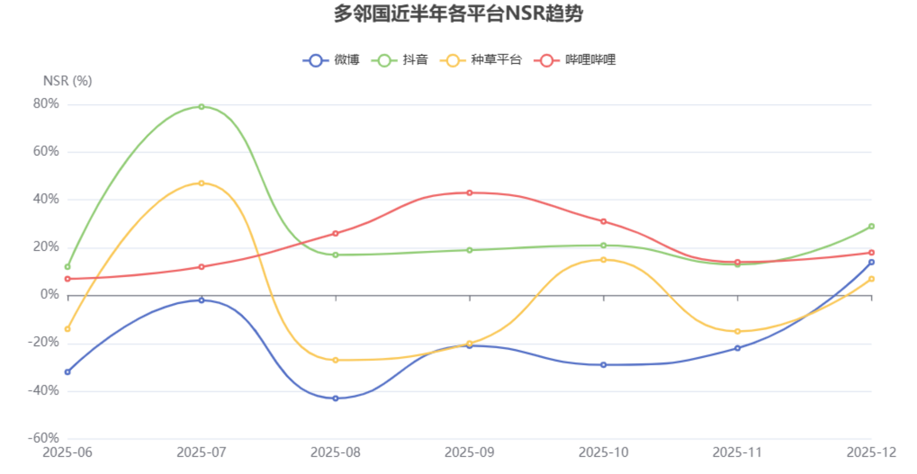 - 抖音与B站的口碑稳定性: 抖音和B站的平均NSR持续为正(分别为27.14%和21.57%),口碑表现稳健。 抖音用户对“流氓式”督学等幽默内容接受度高,而B站用户对知识性、趣味性内容(如原创动画、深度解读)表现出高认可度,形成了稳定的正面口碑池。