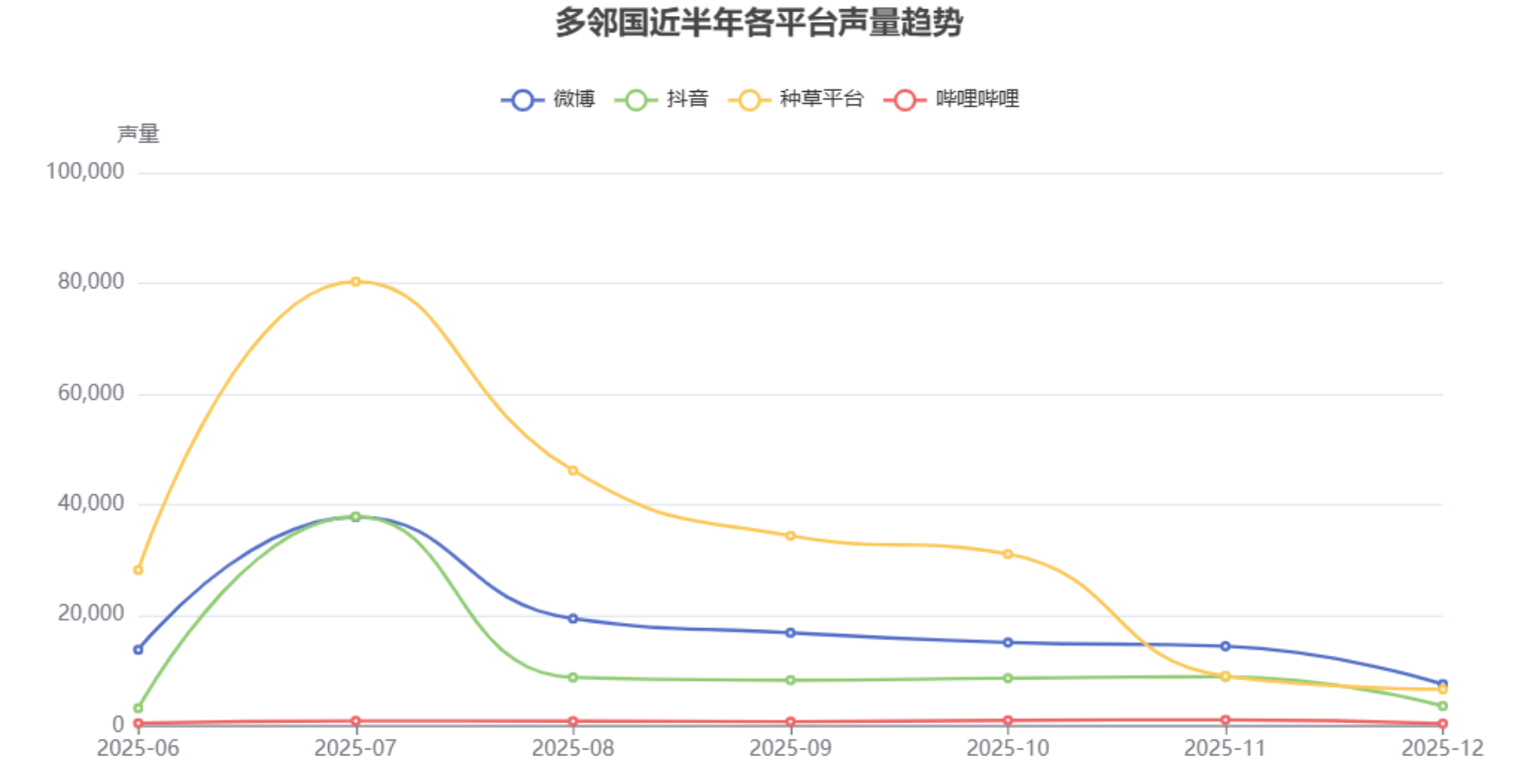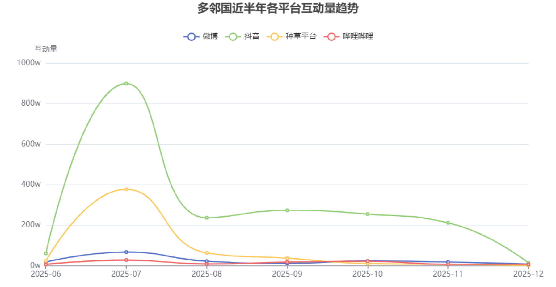 在近半年内,多邻国在主要社交媒体平台的声量和互动量表现出显著的波动,与关键营销活动高度相关。其中,2025年7月的瑞幸联名活动是所有平台数据表现的绝对高峰。