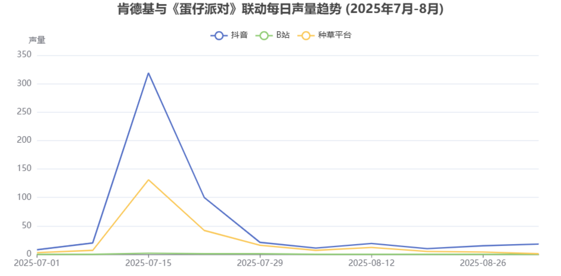 在社媒表现方面,本次联动在抖音、Bilibili和种草平台等平台均引发了显著的关注。活动在7月14日预热和7月19日正式发售时达到声量与互动高峰。例如,抖音平台在7月14日声量峰值高达 1,272 条 [47] ,7月19日的互动量也达到了 83,453 次 [50] 。Bilibili和种草平台也呈现了相似的高峰趋势。 [48,49,51,52]
