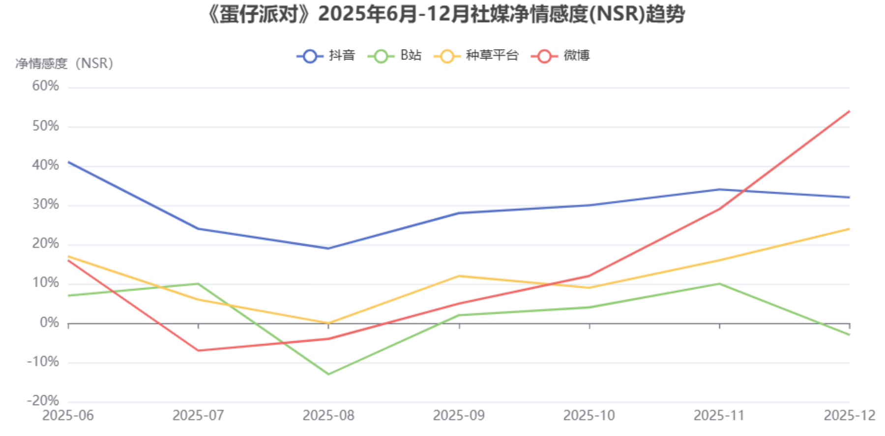 尽管《蛋仔派对》在暑期维持了高热度,但其净情感度(NSR)却普遍下滑,呈现“高热度低情感”的背离现象。 尤其在8月,抖音NSR降至19%,B站跌至-13%,种草平台为0%。 [12,17,23] 微博NSR更是在7月和8月连续为负。 [20] 这种现象的核心根源在于暑期集中爆发的“蛋仔派对骗局”事件以及部分IP联动(如《鬼灭之刃》)引发的质量争议,严重侵蚀了玩家的信任和情感。