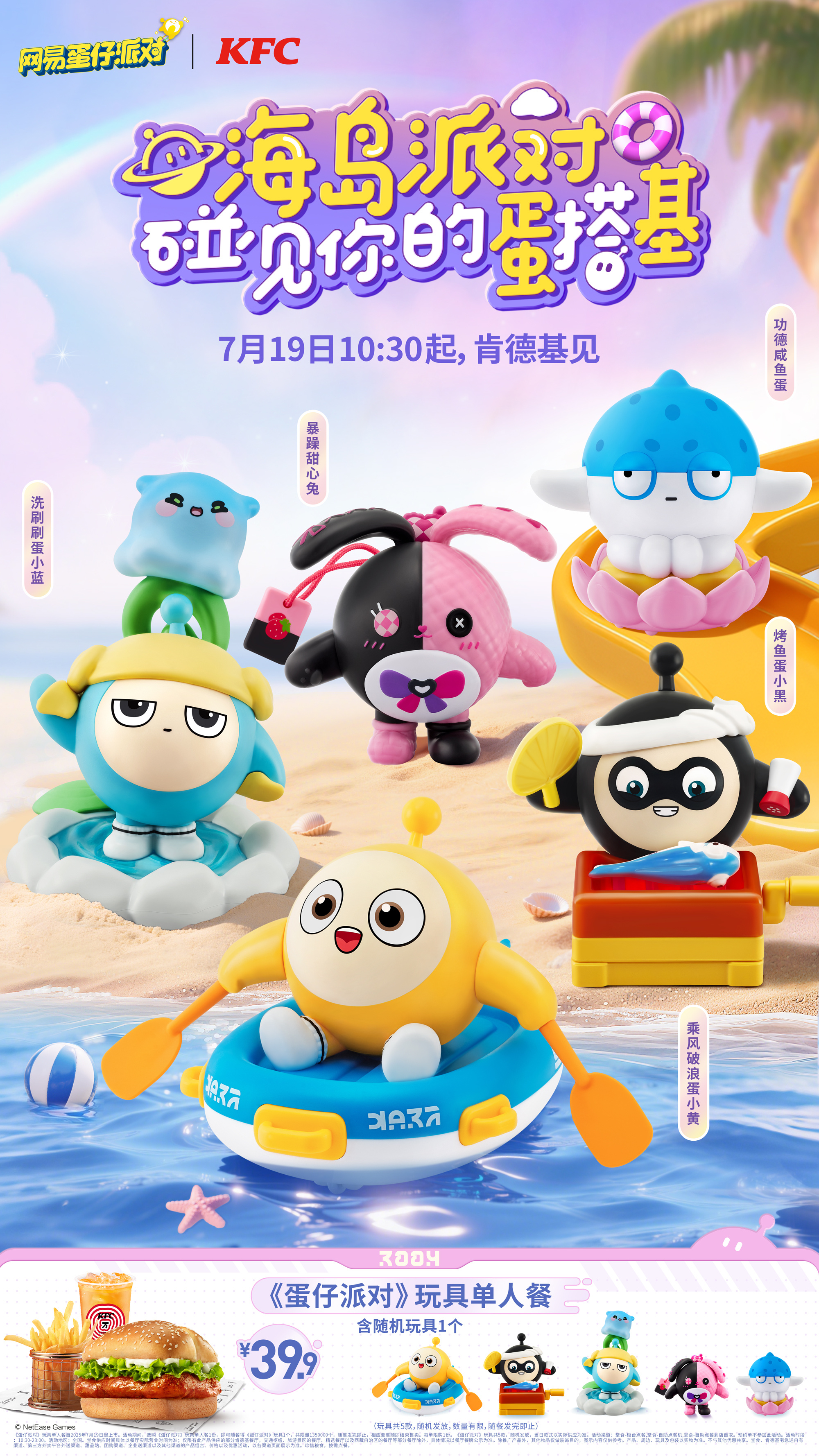 肯德基与《蛋仔派对》于2025年7月至8月展开了第二次联动,推出了包含五款全新联名玩具的套餐,包括 乘风破浪蛋小黄 、 烤鱼蛋小黑 等,并推出了“双玩具套餐”等多种形式。 [46]