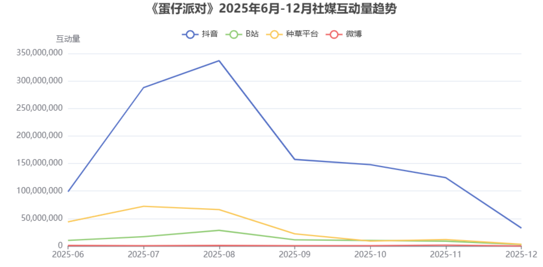 各平台的互动量趋势与声量趋势基本一致,均在暑期达到高峰。抖音和B站的互动量在8月达到峰值,分别为3.37亿和2849万。 [11,16] 种草平台的互动量在7月达到峰值,为7223万,主要受暑期福利和联动预热信息刺激。 [22] 微博平台的互动量则在11月达到166万的最高点,这可能与电商平台双十一期间的营销合作有关。 [19]