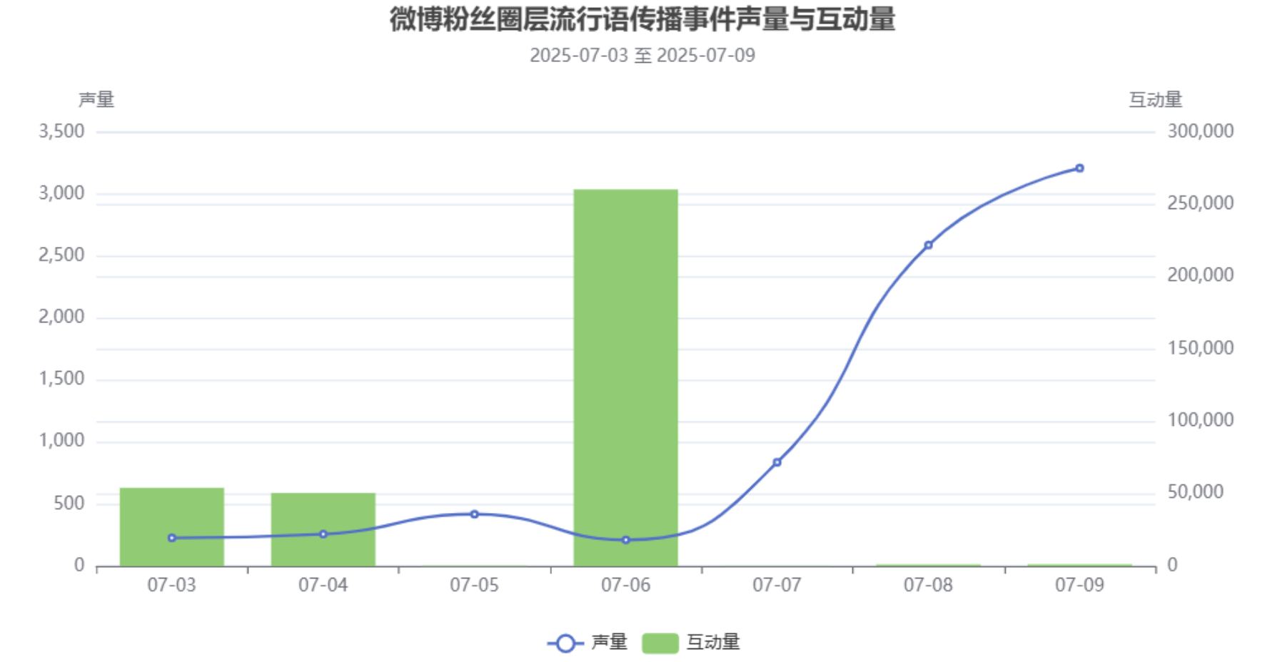 此次事件最值得关注的是声量与互动量的“背离”。如图表所示,7月6日声量仅为212条,但互动量却飙升至 260,590 次的周期顶峰。 [61,62] 这表明,少数由核心粉丝(如@东京听祎季 的相似帖互动量高达15.6万 [60] )发布或转发的内容,在短时间内引发了粉丝社群的集中、高强度互动。而随后的7月8-9日,声量虽攀升至3000以上,但互动量骤降至千余次,说明流行语进入了更广泛但浅层的传播阶段。