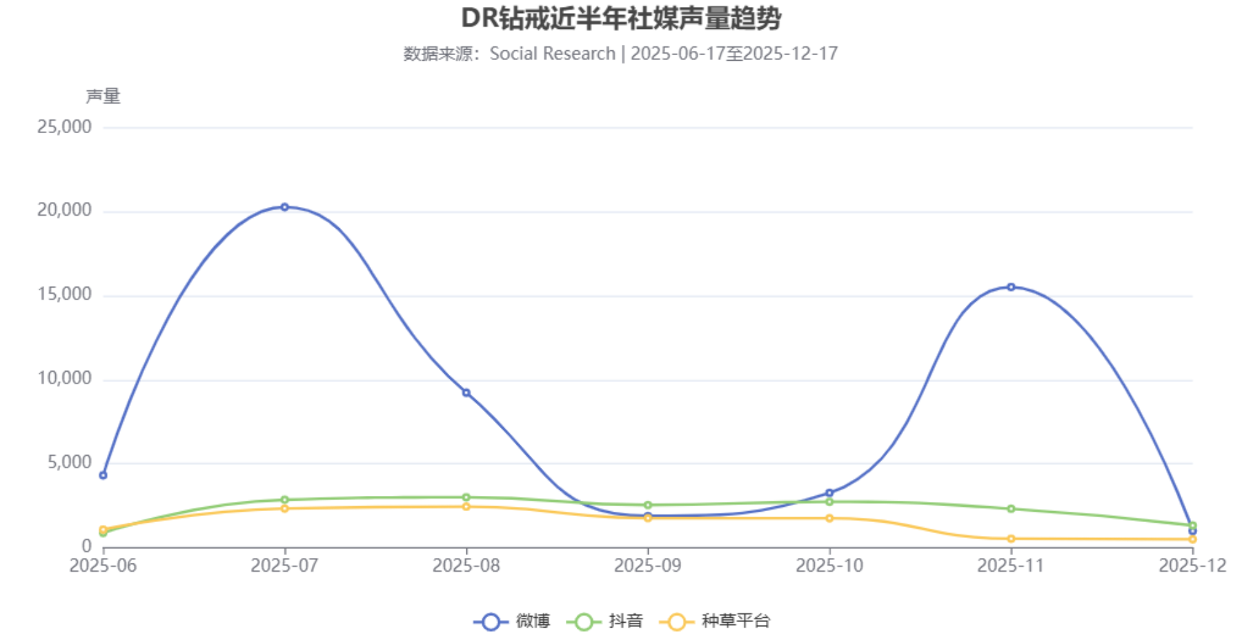 DR钻戒在微博、抖音、种草平台三大平台的声量与互动量表现各异,反映了其差异化的平台运营策略和不同平台的用户行为特点。