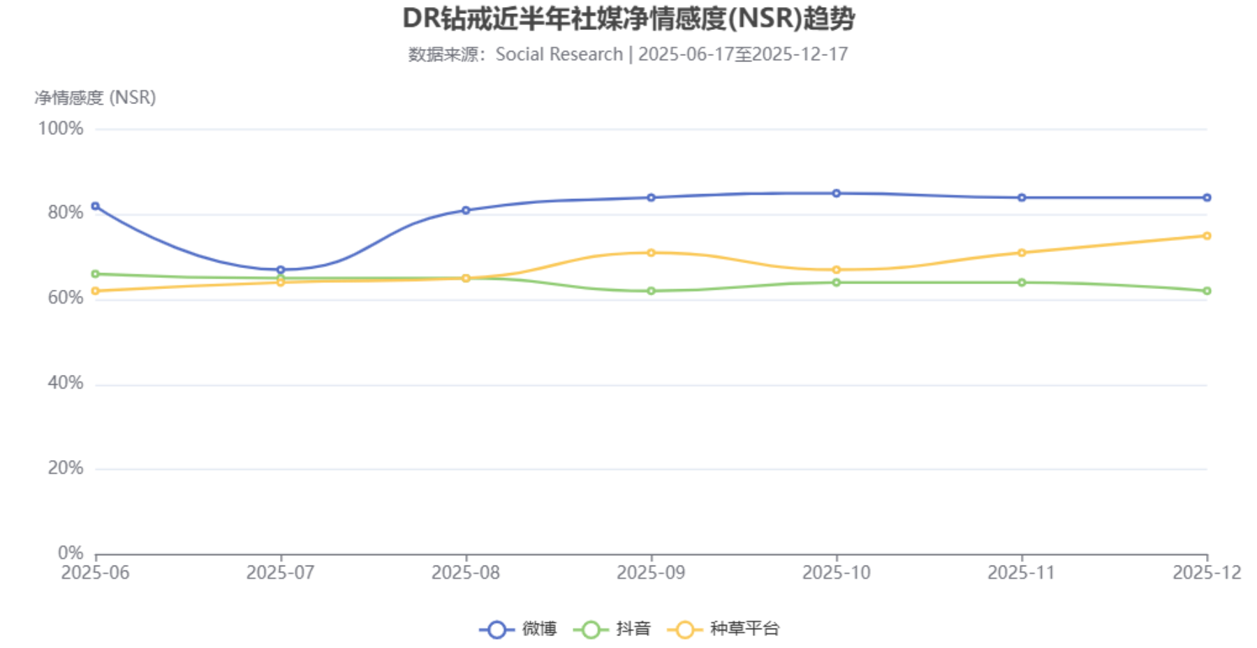 净情感度(NSR)是衡量品牌口碑的重要指标,反映了公众情绪的总体倾向。 [29] DR钻戒在不同平台的NSR表现差异显著,这与其内容策略和平台生态密切相关。