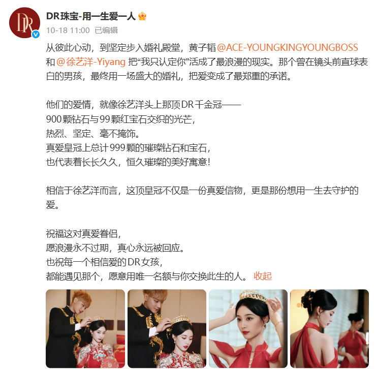 “黄子韬徐艺洋大婚”事件是DR钻戒在2025年下半年最成功的营销活动之一,通过与明星婚礼的深度绑定,不仅提升了品牌曝光度,更有效推广了新品“DR千金冠”,强化了品牌的高端与情感价值。