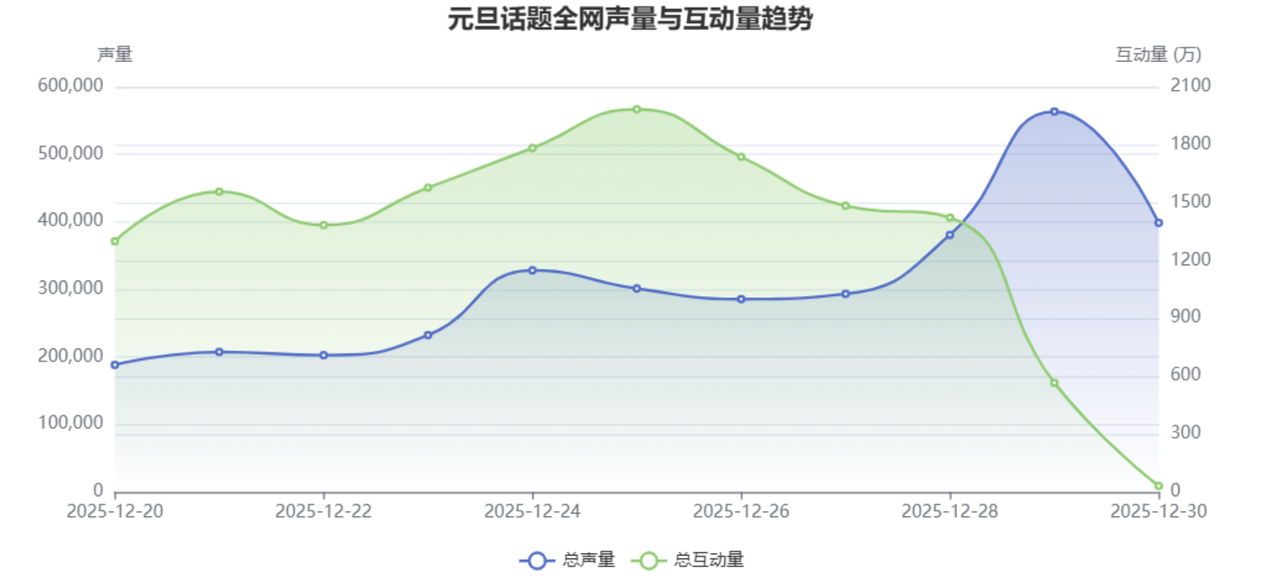 在2026年元旦假期临近之际,中文社交媒体平台展现出强烈的节庆氛围与高度的用户参与热情。从2025年12月20日至12月30日,海量用户围绕“元旦”相关话题分享计划、交流感受,形成了独特的舆论场。本章节将从讨论声量、情感倾向及平台分布等维度,对这一时期的社媒整体趋势进行剖析。