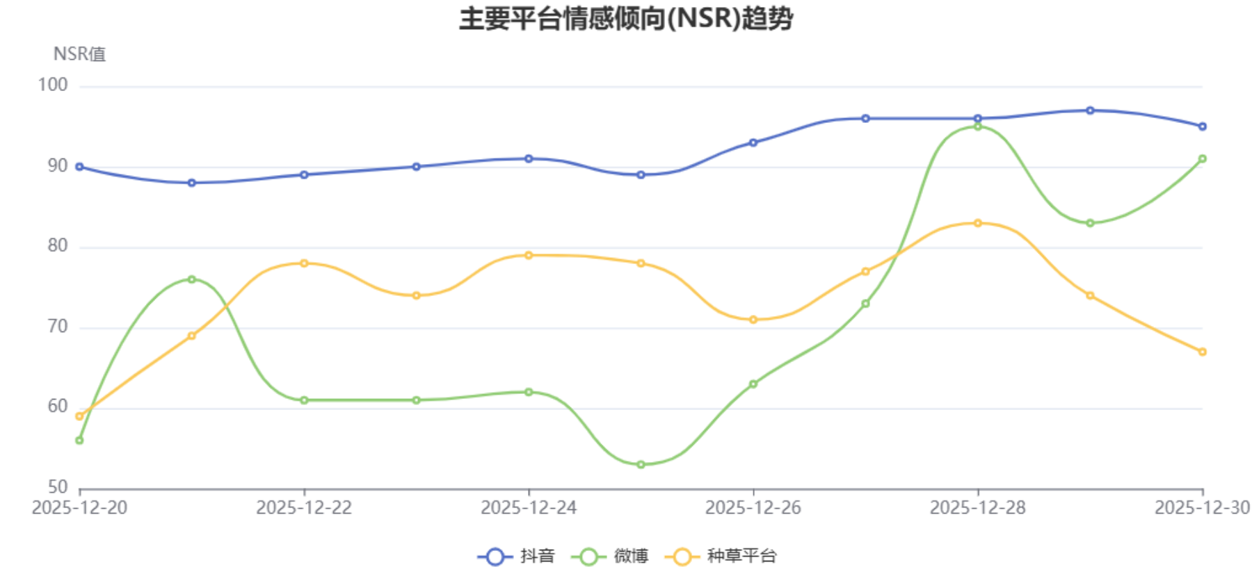 - 微博平台: 情感倾向呈现“逐步升温”的态势。12月26日前,NSR在53-76之间波动,情绪相对中性;而从12月27日起,NSR显著拉升,最高达到95。这表明随着假期安排的尘埃落定和节庆活动的临近,用户的积极情绪被充分调动。 [5,10]